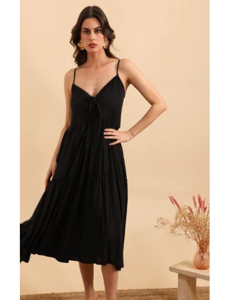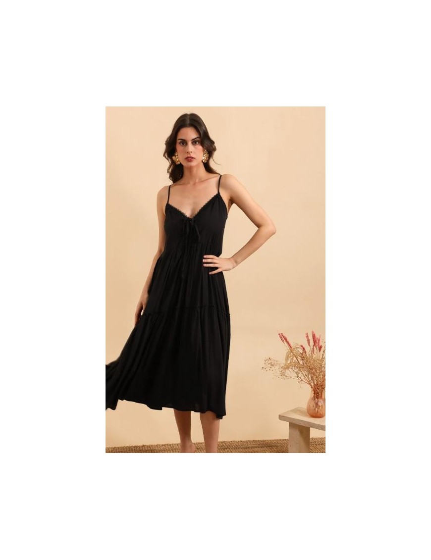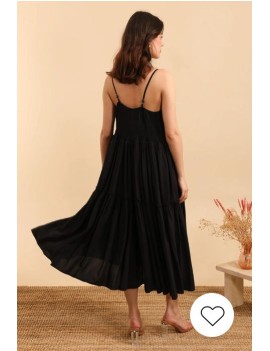 Une jolie robe noire a avoir dans sa garde robe, un classique facile à porter en journée ou bien en soirée, bretelles fines réglables, fluide et légère.