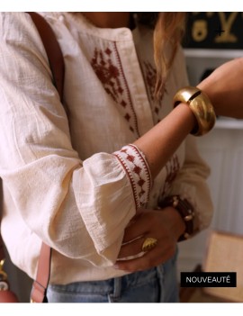 La chemise Athena séduit par son allure authentique et raffinée. Confectionnée dans une toile légère écrue, elle se distingue par ses broderies terracotta placées le long de la patte de boutonnage et sur la poitrine, évoquant un savoir-faire artisanal délicat. Son col officier minimaliste apporte modernité et structure, tandis que ses manches longues légèrement froncées aux épaules créent un joli volume.