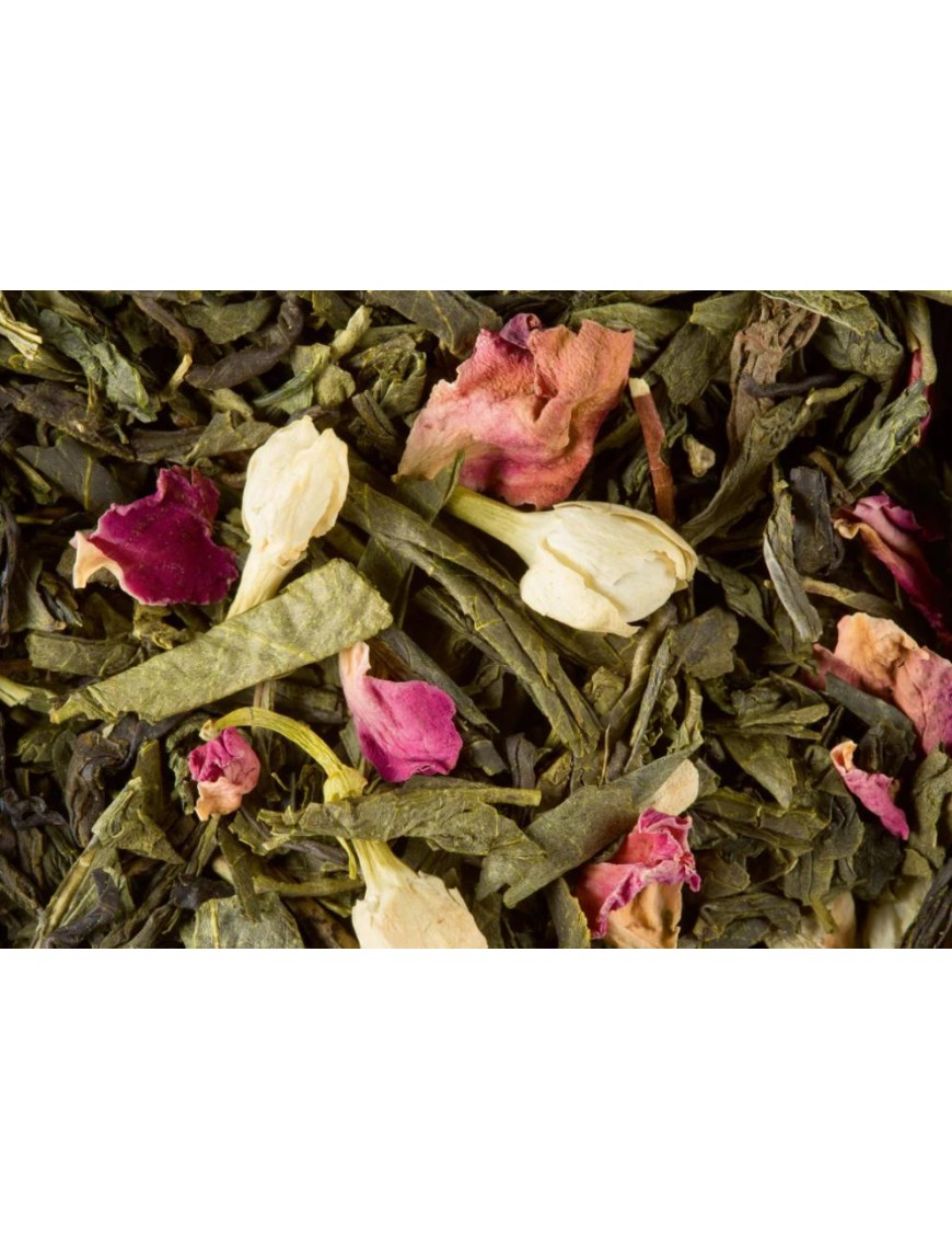 Subtil équilibre de notes fraîches, fleuries et fruitées pour ce mélange délicatement parfumé à apprécier tout au long de l’année préparé tant chaud que glacé. Ingrédients : thé vert et thé vert au jasmin, pétales de fleurs, arômes litchi, pamplemousse, pêche de vigne et huile essentielle de rose.