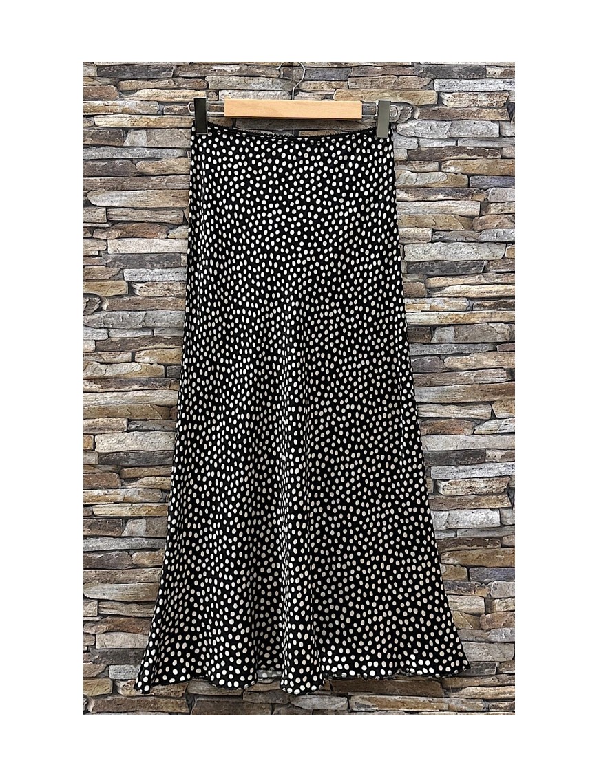 Jupe imprimé pois en viscose satinée effet soie avec bordure dentelle, fluide et romantique. ..