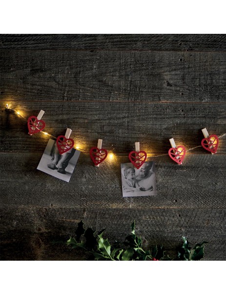 Guirlande lumineuse avec 20 clips coeurs rouges en bois 30 cm ambiance blanc argenté chaleureux pour usage intérieur