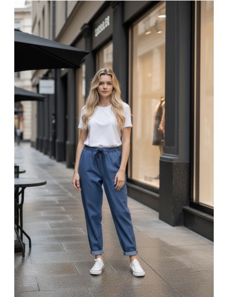 Ce pantalon est un classique de la garde-robe, ceinture élastique, reserrage avec un cordon à la taille, très confortable.