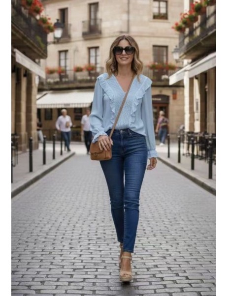 Chemise en V bleu ciel manches smokées