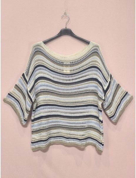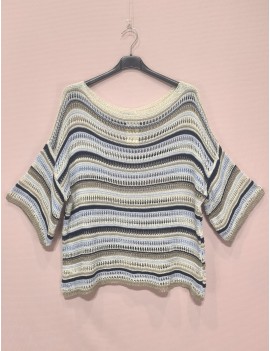 Ce pull léger à la coupe oversize et décontractée se distingue par son jeu de rayures horizontales. Confectionné dans une maille ajourée fluide, il offre une transparence subtile et une respirabilité idéale pour les beaux jours.