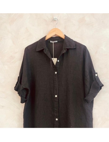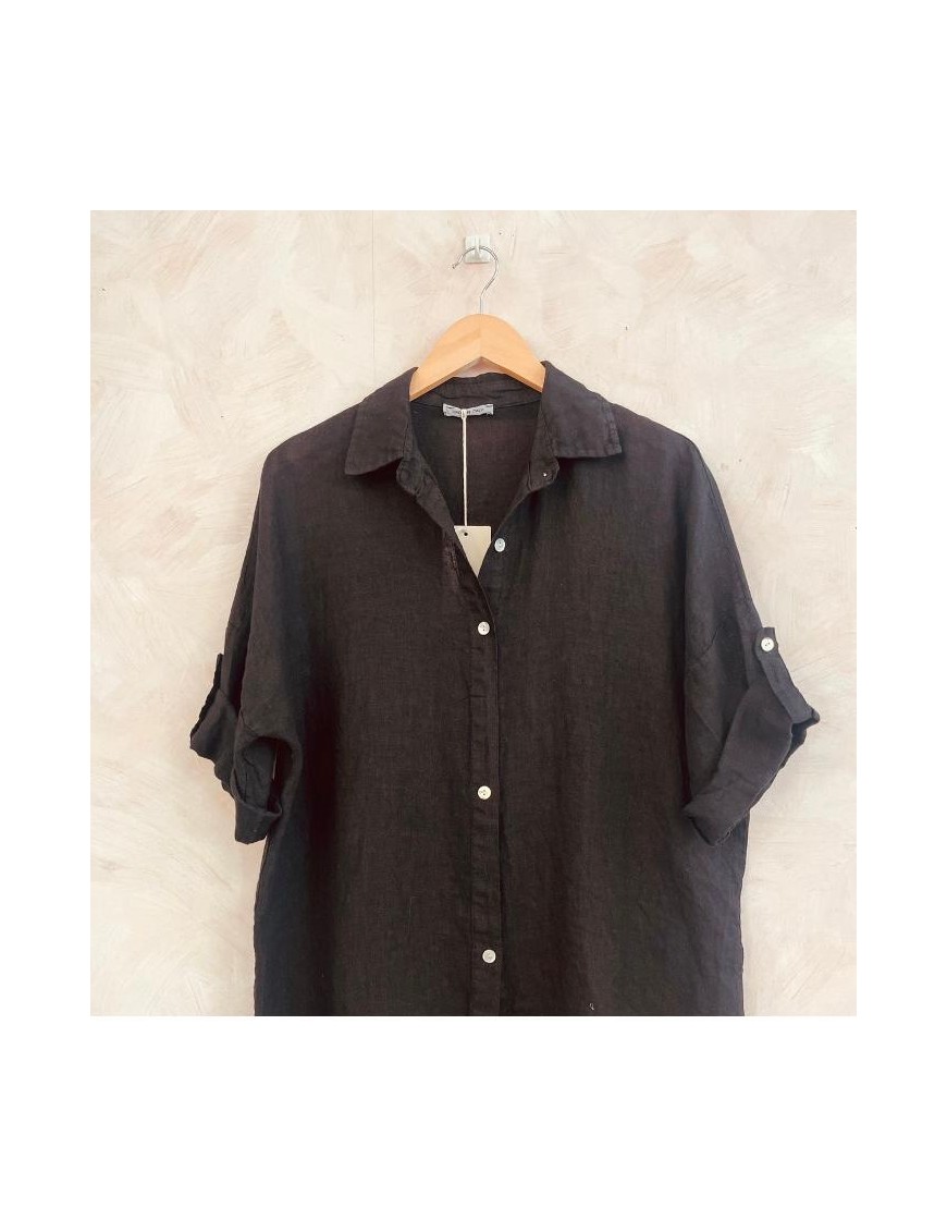 Jolie chemise noire manches 3/4, avec pattes pour raccourcir pour des manches courtes, petits boutons en nacre, un jolie classique pour le Printemps-Eté.