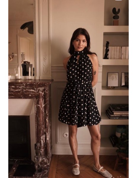 Une touche de légèreté et d'élégance à votre tenue avec cette robe à pois blancs ornée d'un col montant et d'une ceinture à nouer à la taille. Son imprimé intemporel s'adaptent à toutes vos envies.