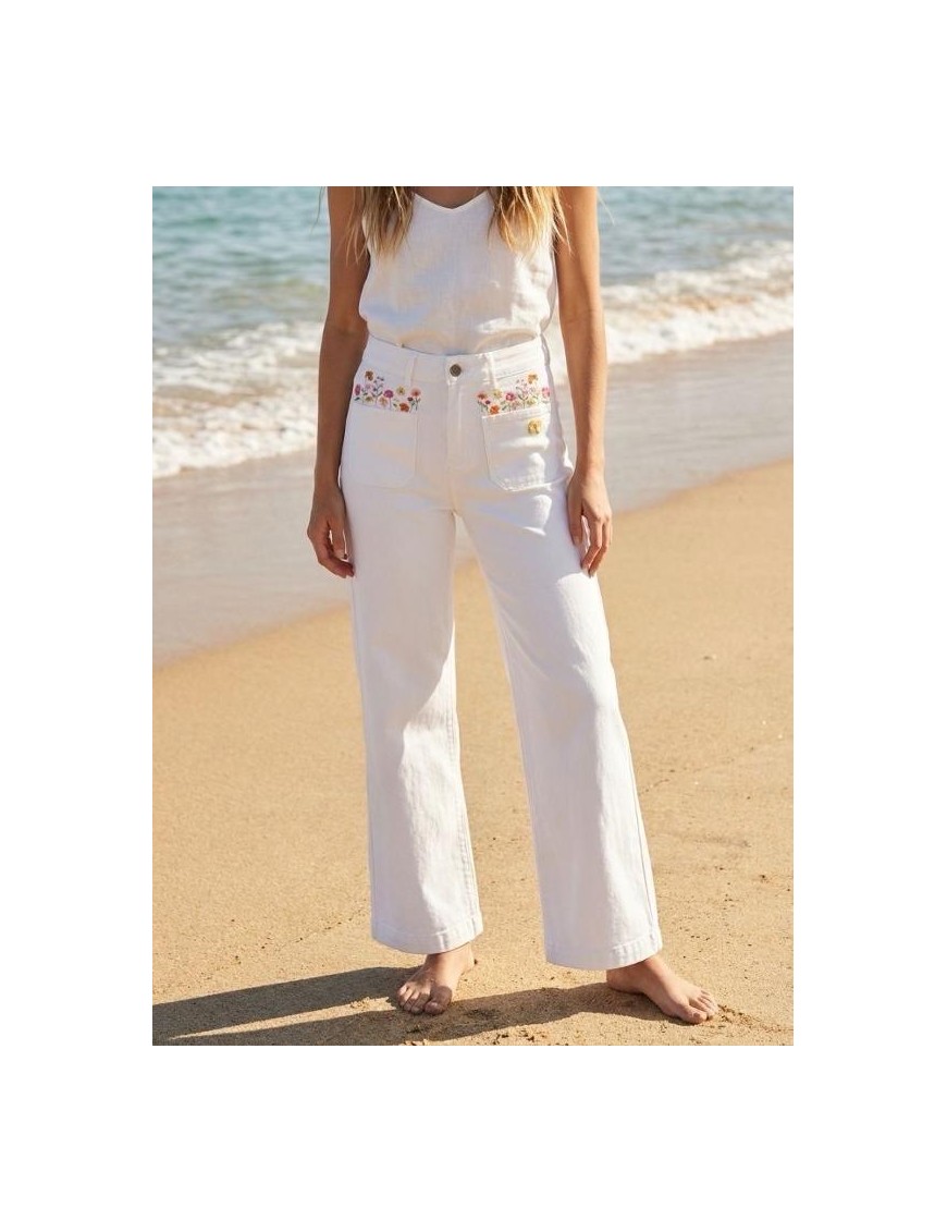 Pantalon jean's blanc coupe tendance, poches carrées plaquées, très confortable et souple, les fleurs brodées de couleurs amènent de la gaieté à votre garde robe.