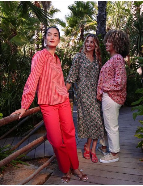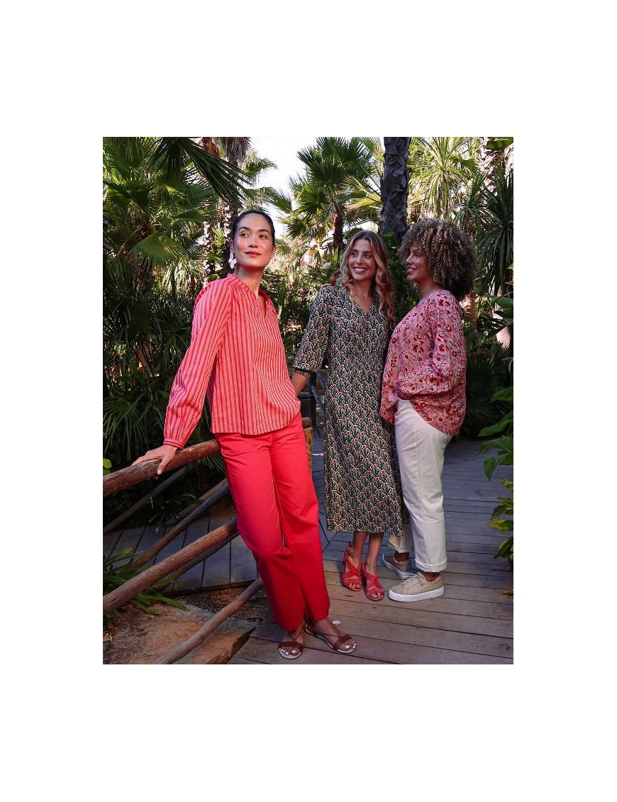 Robe midi fluide au charme naturel, parfaite pour une allure féminine et élégante. Son encolure en V et sa taille smockée soulignent la silhouette tout en offrant un confort optimal.
