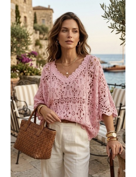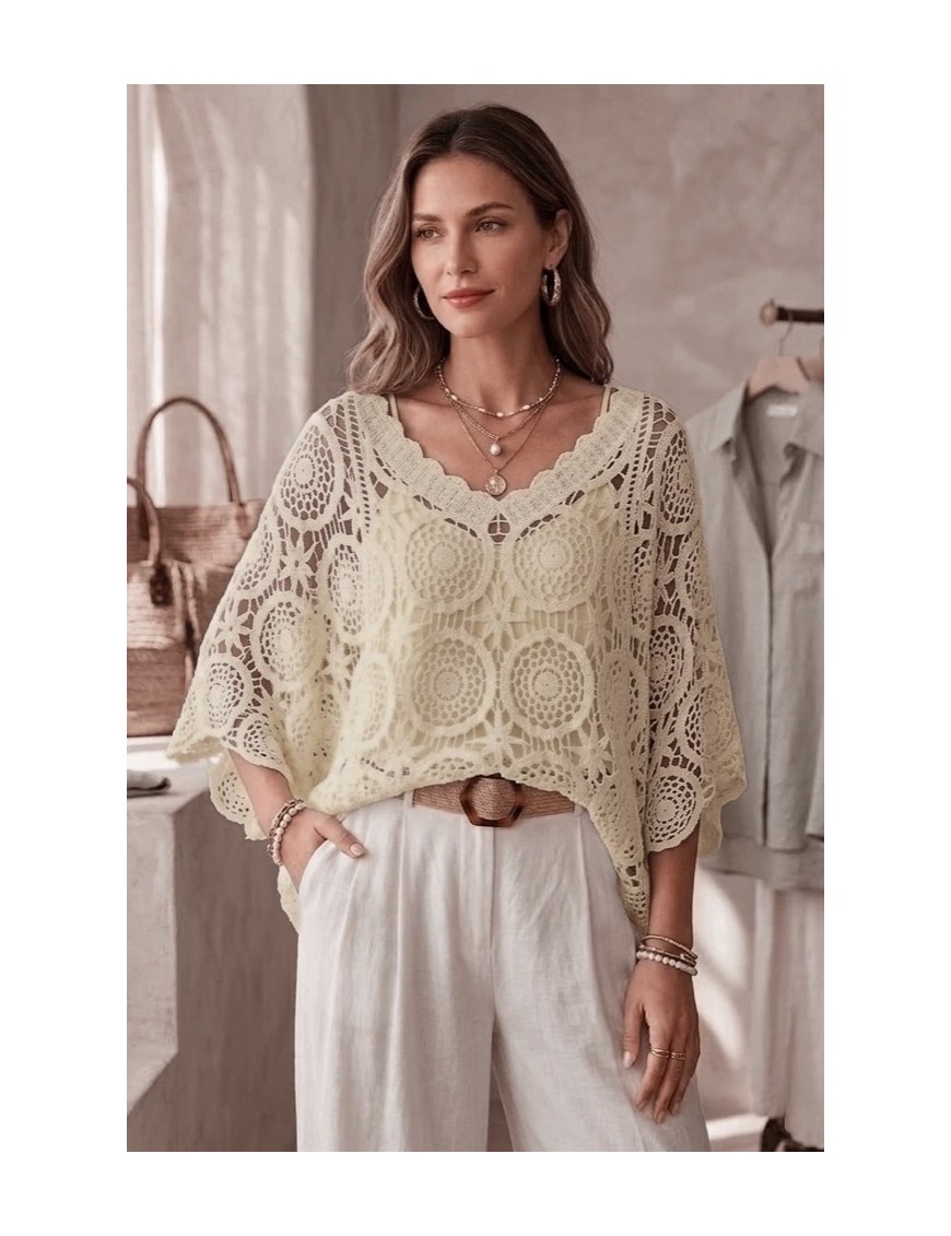 Haut en crochet au design floral , apportant une touche bohème et élégante. Il présente des manches style chauve-souris offrant une silhouette fluide et aérienne. Les motifs travaillés en maille ajourée créent un jeu de transparence subtil et féminin.