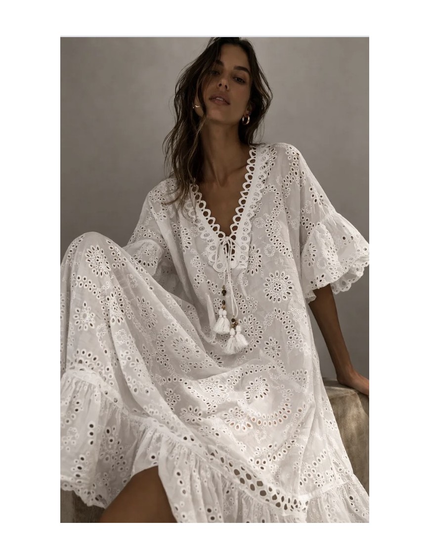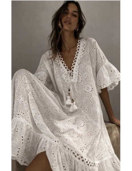 Robe pour femme en tissu broderie anglaise en coton, au design romantique et raffiné. Le modèle présente un décolleté en V avec broderie décorative et lacets à pompons, ajoutant une touche féminine et délicate. Les manches amples trois-quarts apportent du volume et du confort, tandis que la coupe fluide descend en une jupe à volant final, créant mouvement et légèreté.