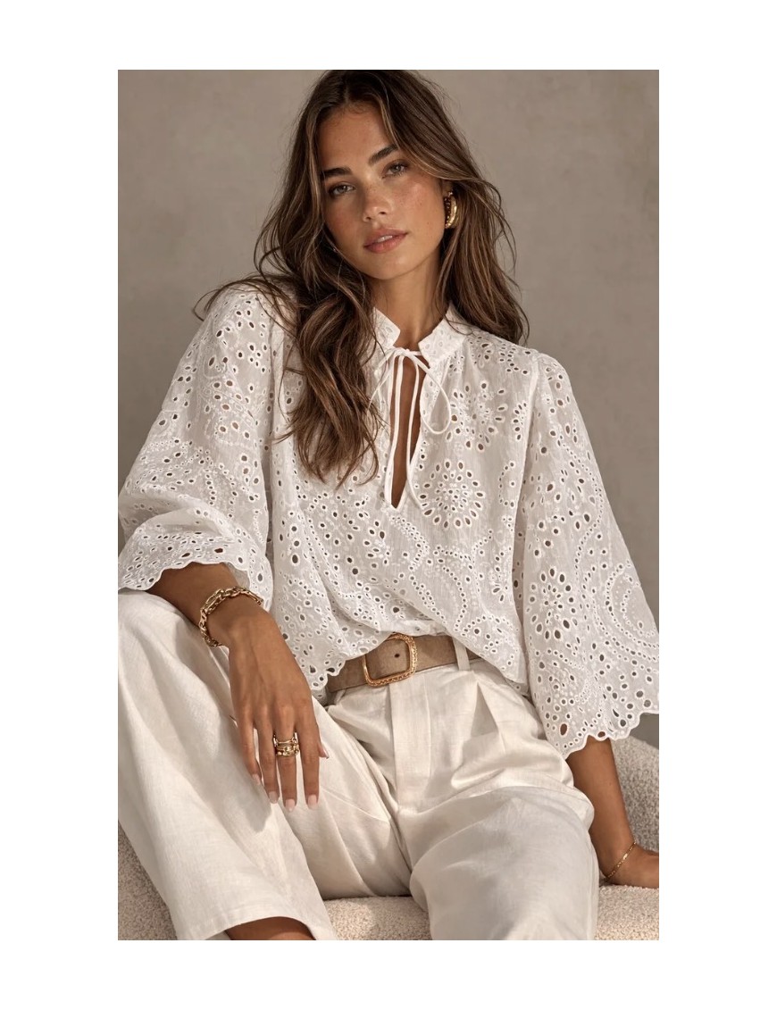 Chemise féminine en coton léger brodé de broderie anglaise, caractérisée par un motif floral ajouré raffiné qui apporte luminosité et mouvement au vêtement. Le design présente un décolleté en goutte avec des lacets réglables et un petit col froncé, un détail qui ajoute une touche romantique et délicate.